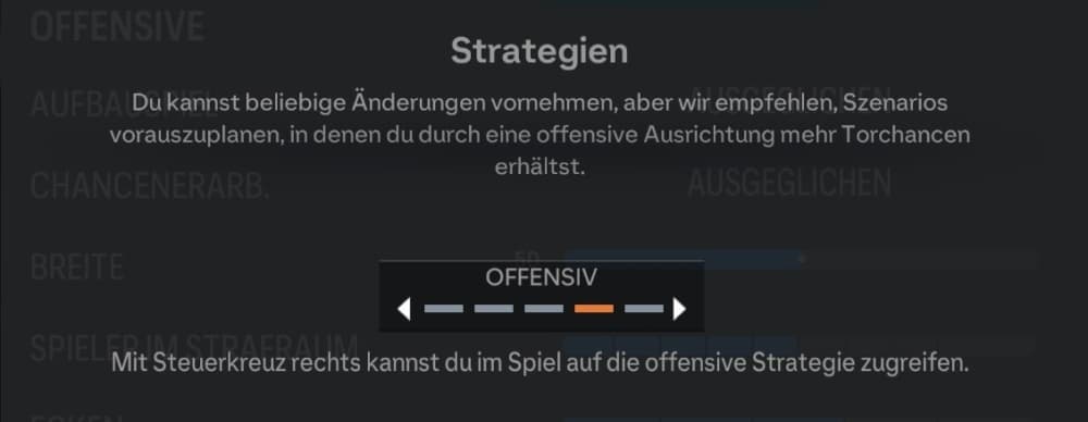 Um die Strategie und damit auf die Aufstellung im Spiel zu ändern, muss man einfach nur die Pfeiltaste nach links oder nach rechts drücken. Zur Auswahl stehen die bekannten Strategien und individuellen Taktiken: