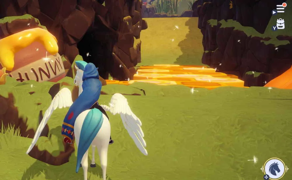 Bevor du die Honigfälle im Feenhain betreten kannst, musst du erst einmal die Quest Kristallhöhle Feenhain beenden. Dafür brauchst du den dritten und letzten blauen Kristallschlüssel, den du automatisch im Rahmen der Tigger-Quest Spaß Spaß Spaß erhältst. Im Anschluss geht es dann in das Wunschblütenherz und dort warten kleinere Rätsel auf dich. Das Ziel ist es wieder die Wunschblüte aus den Fängen der roten Kristalle zu befreien. Am Ende bekommst du dann wieder ein neues Pferd und das ist Pegasus. Das Pferd hat natürlich auch eine besondere Fahigkeit und zwar kann es fliegen. Dafür musst du über einen Wind-Geysir geloppieren und Pegasus wird in die Lüfte geschleudert. Genau so ein Wind-Geisyr ist auch im unteren Teil der Hundertmorgenfelder beim Übergang zu den Honigfällen.