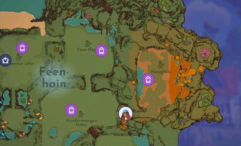 Mit Pegasus kannst du dort auf den Wind-Geisyr zureiten und wirst dann automatisch in die Honigfälle befordert. Einmal dort kannst du dann die Brücke aus Honig freischalten und die Honigfälle danach auch ohne den Flug mit Pegasus betreten. In dem Abschnitt steht auch wieder ein Brunnen, den du mit ein paar Sternenmünzen freischalten kannst. Danach kannst du dich in DDV bequem über die Karte und per Schnellreise in die Honigfälle teleportieren.
