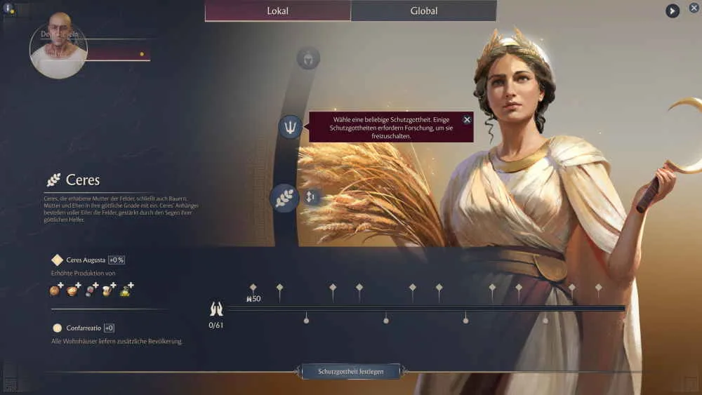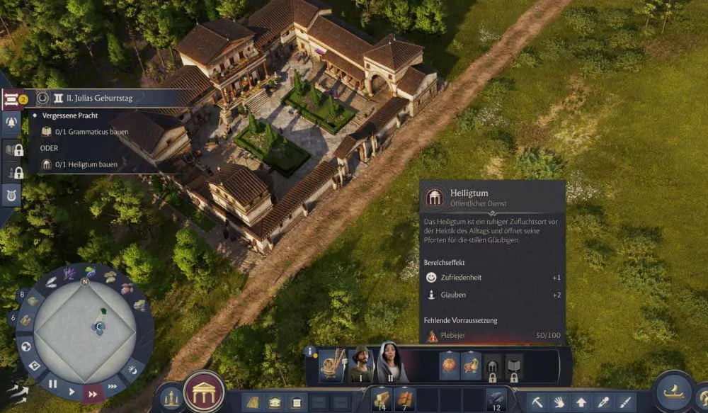 Nach dem Upgrade wohnen in einem Haus um die fünf Bewohner, sodass du für die Freischaltung der Heiligtümer insgesamt 20 Häuser ausbauen musst. Danach kannst du unten in der Menüleiste die Plebejer auswählen und findest dort neben den Einträgen für Brot und Garum auch das Heiligtum und Grammaticus. In dem Heiligtum kannst du dann in einer der nächsten Quests auch die Gottheitim Religionsmenü auswählen.