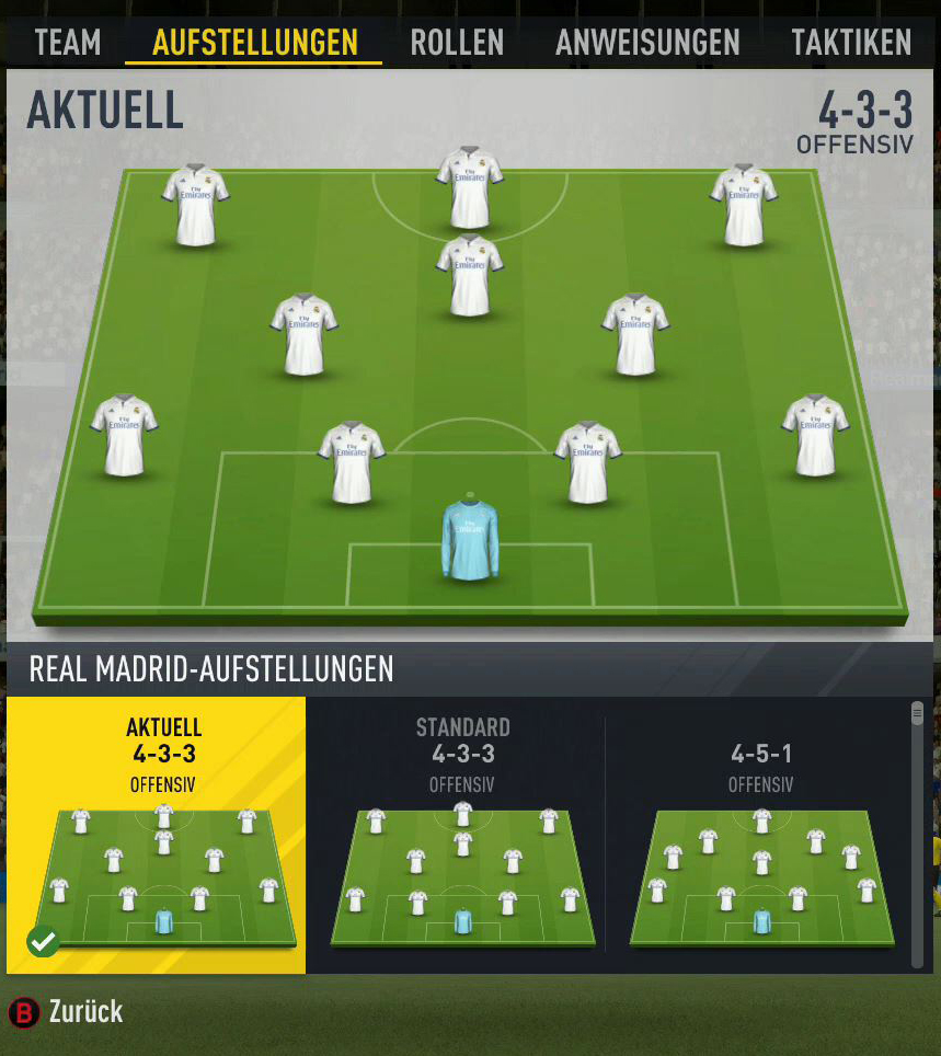 Für FUT könnt ihr gerade bei der 4-3-3-Variante ein wenig durchwechseln, falls ihr z.B. keinen ZOM besitzt, sondern nur ZM-Spieler. Letztlich solltet ihr eure Formation wie beschrieben aber eurem Spielstil anpassen und nicht den Stil der Formation. Das klappt nämlich nicht.