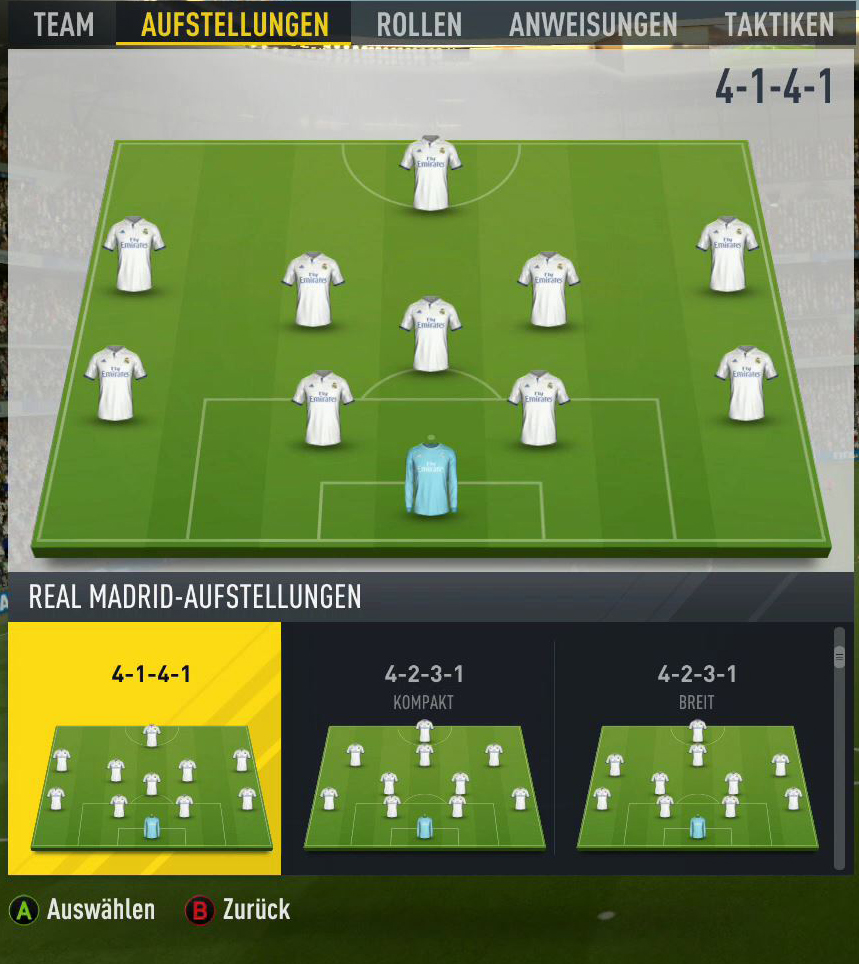 Weiterer Vorteil der Formation: Sie bildet im FUT weniger Verbindungen zwischen den Spielern und lässt sich hervorragend mit der Blocktechnik besetzen. Die Flügelstürmer werden gerne mit Bale und Ronaldo besetzt, während in der Mitte Modric als ZM spielt. 4-3-2-1 ist wie beschrieben vielseitig einsatzfähig, ihr könnt die Flügelstürmer nach vorn schicken, um zu flanken, die Außenverteidiger nachziehen, um Überzahl zu schaffen, den Ball durch die Mitte geben und auch Konter laufen.