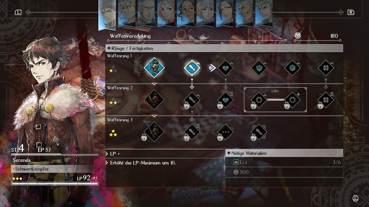 Um einen Charakter zu befördern, braucht ihr spezielle Auszeichnungen. Diese könnt ihr im späteren Spielverlauf beim Krämer erwerben. Auszeichnungen könnt ihr aber auch in Kämpfen erlangen. Lionel könnt ihr beispielsweise mit einem besonderen Ring ausstatten, der die Fundchance einer Auszeichnung erhöht. Da die Auszeichnungen begrenzt und sehr selten sind, solltet ihr euch im Vorfeld gut überlegen, welchen Charakter ihr aufleveln wollt.