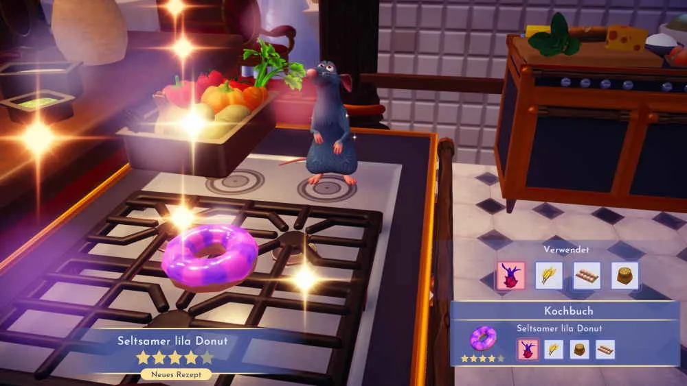 Im Anschluss kannst du den Hundedonut herstellen, der allerdings nicht ganz so gelingt, wie anfangs gedacht. Neben der Frucht benötigst du auch noch einmal Weizen, Eier und Erdnüsse. Den Weizen gibt es bei Goofy auf der friedlichen Wiese und die Eier sowie die Erdnüsse auf dem Regal im Chez Remy.