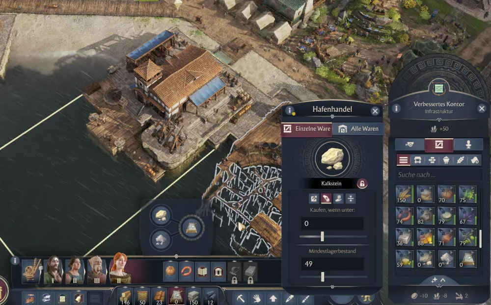 Alternativ kannst du die Kalksteine wie andere Materialien auch kaufen. Klicke dazu auf den Kontor und wähle die Kalksteine aus (es gibt auch eine Suchfunktion an der Seite). Wechsel den Modus dann von „Kein Handel“ auf „Kaufen“ und ändere „Kaufen, wenn unter“ auf die gewünschte Menge“. Achte darauf, dass du ausreichend Denare auf dem Konto hast. Mit Handelsabkommen kannst du den Vorgang noch beschleunigen. Anschließend sollten nach kurzer Zeit die ersten Schiffe an deinem Kontor auftauchen und die Kalksteine abliefern.