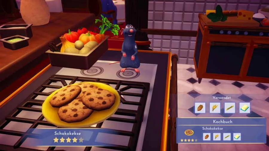 Anders als anfangs gedacht, zählen für die Routine-Aufgabe wohl nicht alle Gerichte mit Schokolade. Nach einigem herumprobieren habe ich allerdings herausgefunden, dass einfache Schokokekse zu etwas Süßes mit Schokolade gehören. Für die Schokokekse benötigst du vier Zutaten und dazu gehören: Kakaobohne, Weizen, Zuckerrohr und Butter. Die Kakaobohne kannst du in der Lichtung oder sonnigen Ebene sammeln. Den Weizen gibt es bei Goofy auf der friedlichen Wiese und das Zuckerrohr am schillernden Strand. Fehlt nur noch die Butter und die kannst du bei Remy kaufen. Besorge gleich mehr von den Zutaten, da du die Kekse fünfmal zubereiten und dann verschenken musst. Es spielt keine Rolle, welche Bewohner du mit den Schoko-Süßigkeiten beschenkst. Wichtig ist glaube ich nur, dass es fünf verschiedene Bewohner sind.