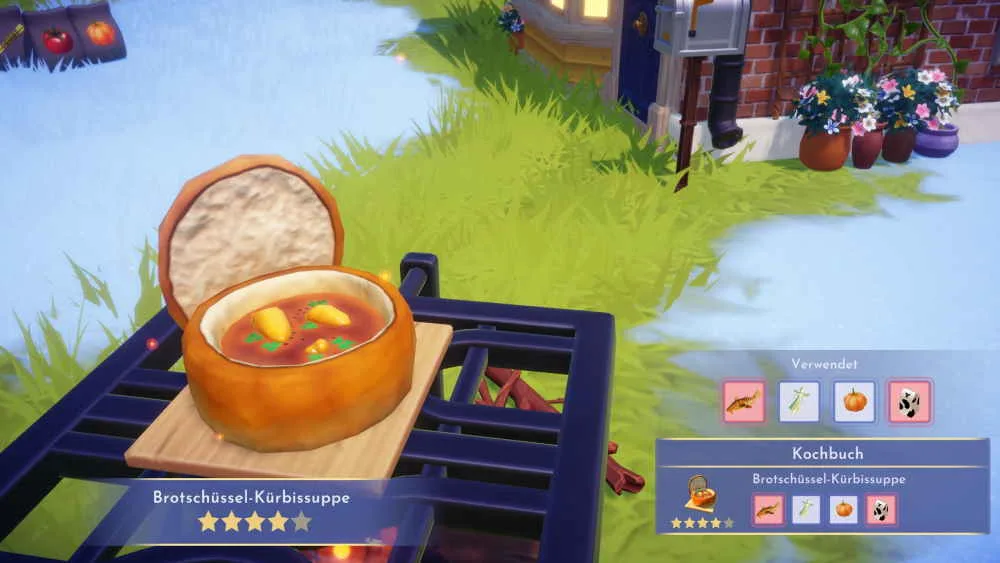 Für die Zubereitung der neuen Kürbissuppe benötigst du einen Tigger-Fisch, Feenkamut, Kürbis und Milch. Der Tiggerfisch ist ein seltener Fisch aus dem Feenhain. Suche auf dem Wasser nach orangen Kreisen mit aufsteigenden Luftblasen und wirf dort die Angel aus.