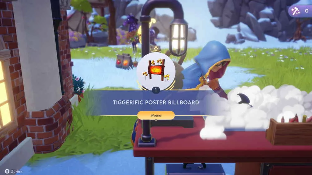 Für die Party fehlen noch tiggeritastische Plakate. Für die Herstellung brauchst du 10x wiederverwertetes Holz, 3x antike Bügeleisen, 1x schwarze Seidenblume, 1x rote Seidenblume und 1x gelbes Maiglöckchen. Stelle die Plakate her und platziere sie in den Blütenwunschbergen. Nach dem Foto ist die Ein Tiggeritastischer Tag Quest beendet.