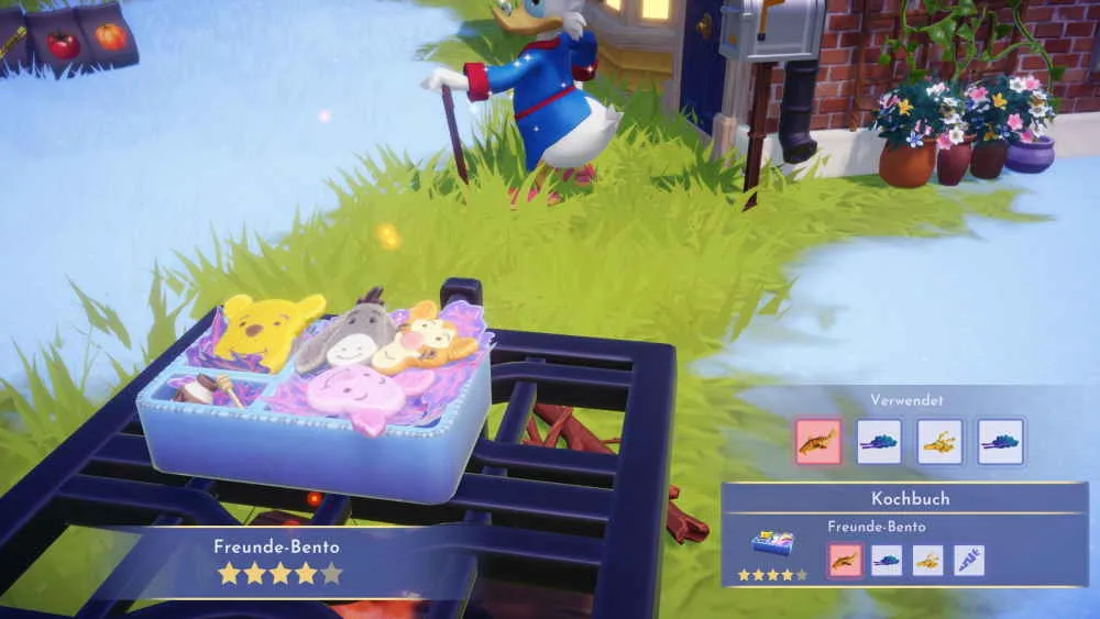 Nach dem Start der Tigger-Quest geht es zuerst zu Schneewittchen, um dir Ratschläge einzuholen, wie du den einsamen Tigger wieder aufmuntern kannst. Im Gespräch ist dann die Rede von mehreren Gerichten, die Tigger gerne isst. Zum Abschluss überreicht sie dir drei Rezepte und dazu gehören die Tigger-Schweife, die Brotschüssel-Kürbissuppe und das Freunde-Bento. Die drei Rezepte sind alle neu aus der Wishblossom Ranch Erweiterung. Öffne dein Inventar und erlerne die Rezepte.