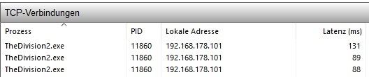 - Hier solltest Du jetzt mehrere Einträge der „TheDivision2.exe“ sehen können. Die letzte Spalte zeigt die Latenz in ms an (also dein Ping). Die eigentlich Latenz der Spielverbindung ist übrigens der Eintrag, der sich circa sekündlich aktualisiert.