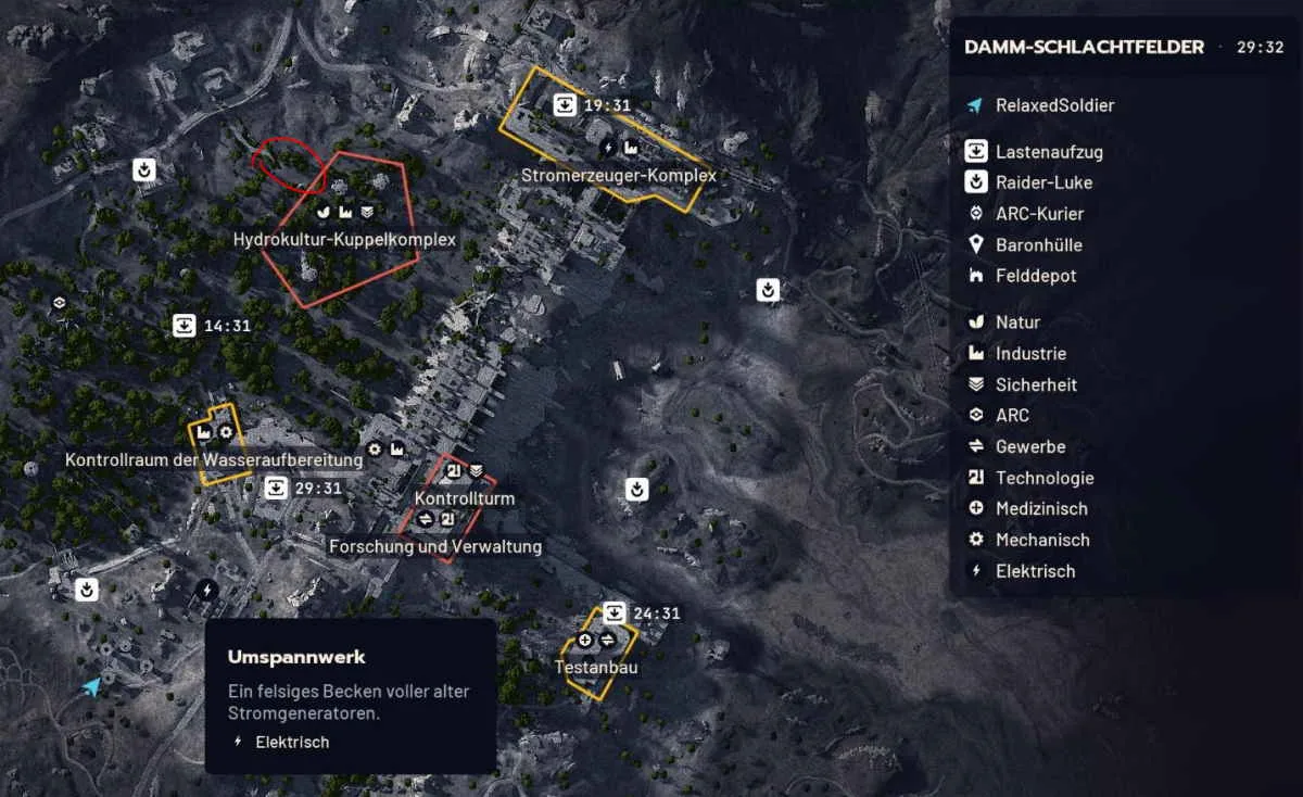 In der Quest-Beschreibung heißt es „Ein ungutes Gefühl: Schon die kleinste Änderung am Verhalten der ARC könnte eine Katastrophe bedeuten. Und das Signal, das du gehört hast? Sowas haben wir noch nie aufgefangen. Wenn die irgendetwas vorhaben, müssen wir das unbedingt herausfinden“. Die gesuchten Arc-Sonden oder auch die ARC-Kuriere findest du in der Nähe der roten Loot-Zonen. In dem ersten Gebiet Damm-Schlachtfelder spawnt zum Beispiel eine ARC-Sonde in der Nähe des Flusses bei dem Hydrokultor-Kuppelkomplex im Nordwesten der Karte. Der Fundort ist auch nochmal auf der Karte im folgenden Screenshot markiert.