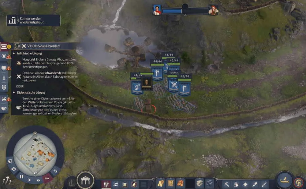 Hauptziel: Erobere Carraig Mhor, zerstöre Voadas „Halle der Häuptlinge“ und 80% ihrer Befestigungen. Das optionale Ziel: Voadas schwindende militärische Präsenz in Albion durch Sabotagemissionen reduzieren. In der Unterquest „Die Scathach sabotieren“ musst du Voadas versteckte Außenposten finden und zerstören. Klicke einfach links auf die Quests, um dir die Fundorte der Insel anzeigen zu lassen. Fahre dann mit zwei Trupps zur Insel, lade die Truppen aus und besiege die gegnerischen Einheiten. Dadurch schwächst du die Verteidigung der Insel.