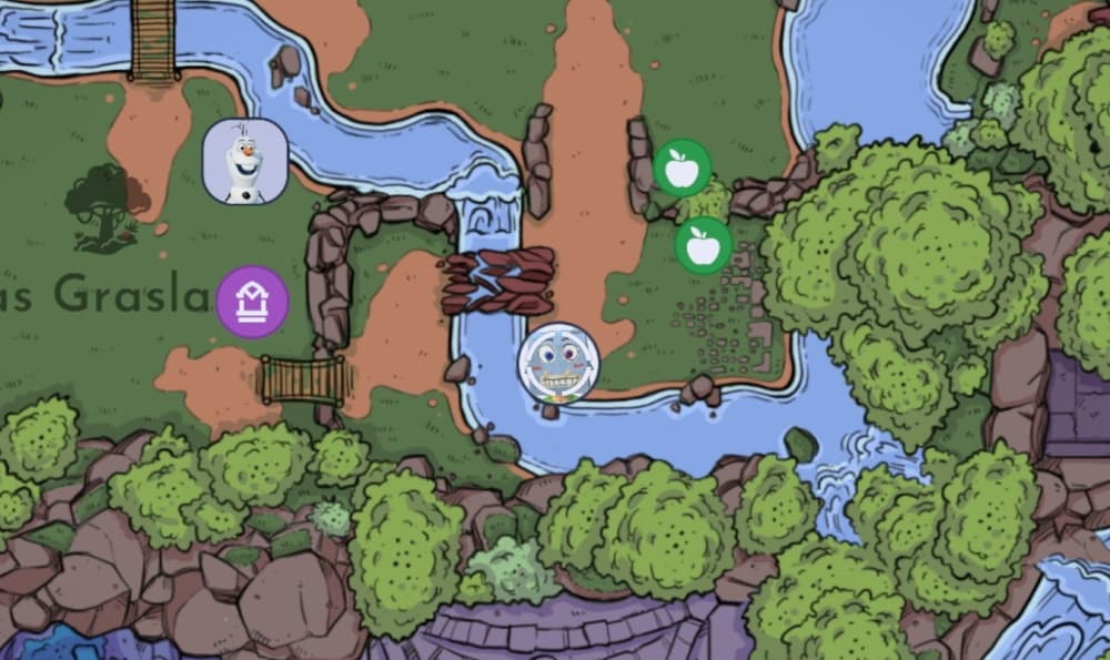 Nach dem Start der „Aufleuchten“-Quest von Rapunzel geht es zuerst einmal zu Mutter Gothel, mit der man über etwas sprechen muss. Von Mutter Gothel erhält man im Gespräch die alte Karte der Insel und darauf sieht man die Fundorte, wo die gesuchten Sonnentropfenblüten wachsen. Die Blüten kann man in den unten gezeigten Gebieten mit der herrschaftlichen Sanduhr finden.