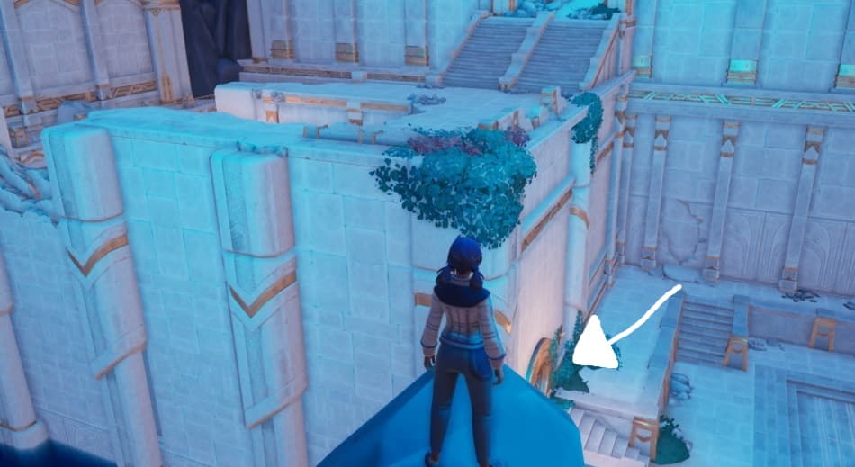 - In der Luft benutzt man dann den Gleiter und fliegt auf die Treppe zu. Im hinteren Bereich sieht man jetzt auch schon ein Bilderrätsel bei dem man die Einzelbilder so verschieben muss, dass man einen Fisch sieht (eine Lösung haben wir im Screenshot eingezeichnet, es gibt aber mehrere Lösungen). Nach dem Bilderrätsel folgt eine kurze Zwischensequenz und man muss Jina von den Entdeckungen berichten.