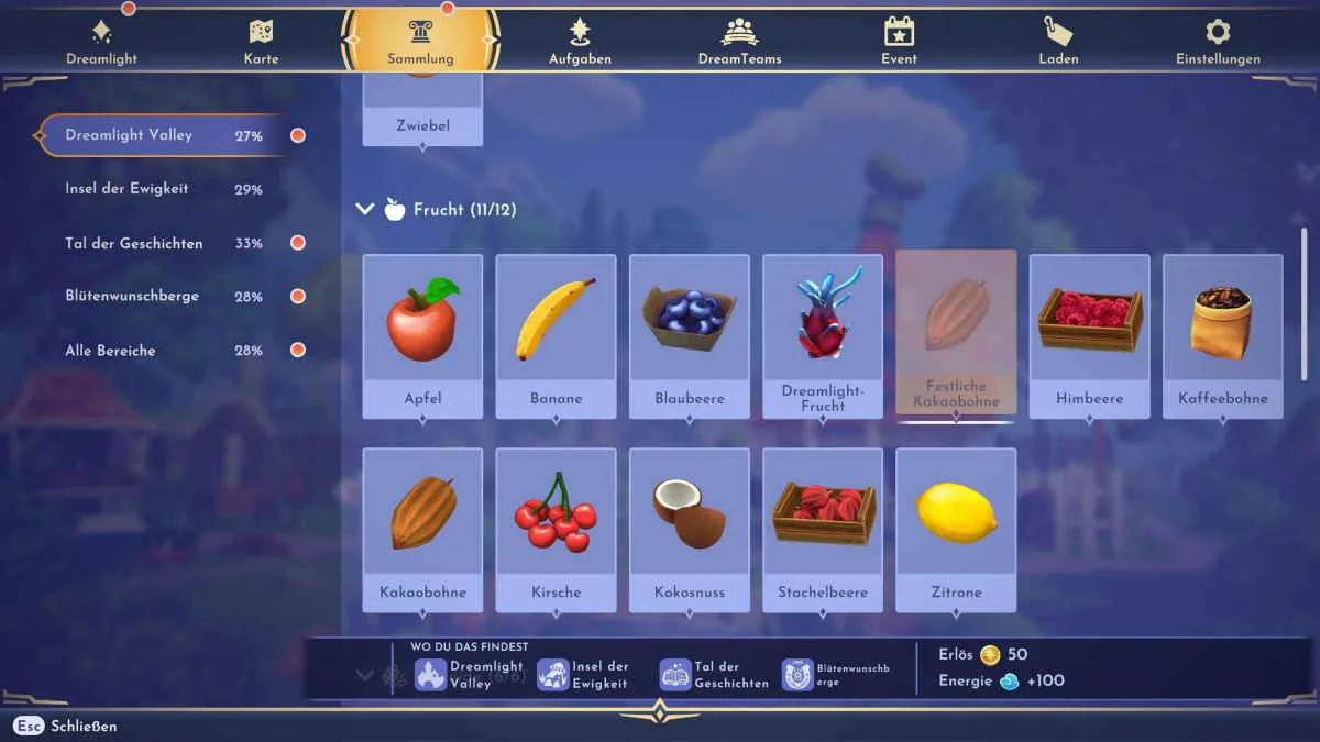 Wenn du in den letzten Tagen mal in die Sammlung der verfügbaren Zutaten in Disney Dreamlight Valley geschaut hast, dann wird dir vielleicht auch die neue und zwölfte Fruchte aufgefallen sein. In der Kategorie von Dreamlight Vaalley wird zwischen der Dreamlight-Frucht und der Himbeere jetzt eine festliche Kakaobohne angezeigt. Die festliche Variante ersetzt übrigens nicht die normale Kakaobohne, die du sonst in der Lichtung des Vertrauens oder der Sonnigen Ebene finden kannst. Ich habe mich gefragt: Was hat es mit der besonderen Kakaobohne auf sich und wo kann ich sie finden?
