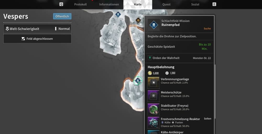 Bei anderen Nachfahren musst du den Stabilisator im Rahmen einer Mission finden und dazu gehört unter anderem der Stabilisator von Freyna. Die Fundorte kannst du dir im Menü anzeigen lassen. Markiere dazu den Gegenstand und über „Info zum Erhalt“ bekommst du Informationen zum Fundort angezeigt. Den Gegenstand von Freyna bekommst du in Vespers im Rahmen der Schlachtfeld-Mission „Ruinenpfad“. Die Drop-Wahrscheinlichkeit liegt bei 20 Prozent. Du musst also wahrscheinlich das eine oder andere mal wiederholen, um den Freyna-Stabilisator zu bekommen.