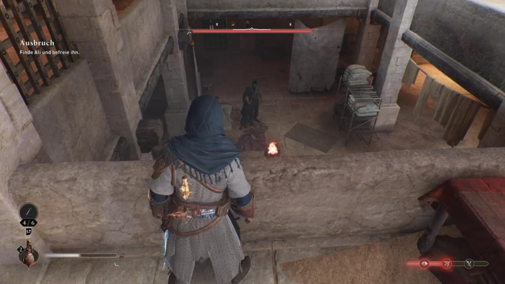 Nachdem man Ali gefunden und mit ihm gesprochen hat, erhält man die Aufgabe die Kammer der Wache zu finden. Die Kammer befindet sich oben in dem ersten Stock des Kellers (Schritt 4). Mit dem gerade gefundenen kann man die Türen aufschließen und zur Kammer der Wache laufen. Nach der Zwischensequenz muss man dann noch aus dem Gefängnis fliehen und damit konnte man „Ali befreien“ und die „Ausbruch“ Quest in AC Mirage abschließen.