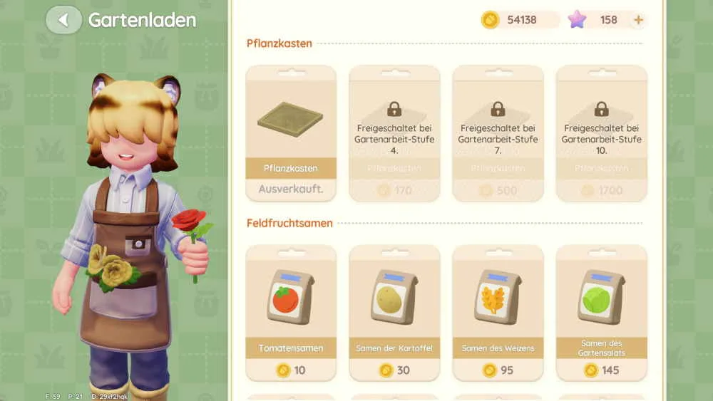Neben den Gemüsesamen kannst du bei Blanc auch noch Blumensamen, neue Felder und Sachen wie Dünger oder auch Wachstumsförderer kaufen. Dieser Artikel befindet sich noch im Aufbau. Weitere Informationen folgen in Kürze.