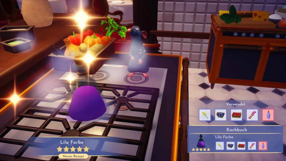 Überreiche ihr die Basis des Raumteilers und triff dich danach mit Jasmin, um über die Magie der Farben zu sprechen. Von Jasmin erhältst du einen lila Farbstoff und musst jetzt die restlichen Zutaten für die Herstellung der lila Farbe besorgen. Dazu gehören Raps, Blau- und Himbeeren sowie ein Tintenfisch.