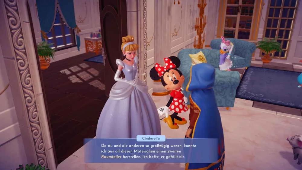 Bereite die lila Farbe am Herd zu und triff dich wieder mit Daisy. Überreiche ihr die zwei Farbstoffe und mit dem farbigen Stoff geht es zu Minnie. Sie überreicht dir eine niedliche Schleife für den Raumteiler. Zum Abschluss folgt noch ein Gruppenfoto und es droppt ein mysteriöser Stofffesetzen. Sammle den Stoffsetzen auf und damit ist die Cinderellas eigene Kreation Quest beendet. Ab Level 4 geht es dann weitert mit dem Kleintiere-Chaos.