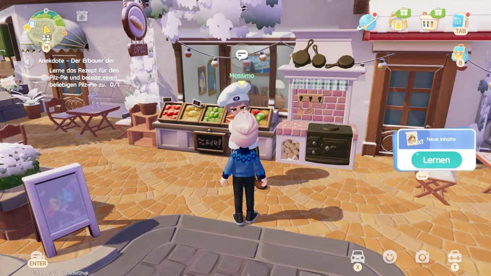 Den Pilz-Pie musst du im Rahmen der Anekdote „Der Erbauer der Pilzsammlung“ von Massimo zubereiten. Im Vorfeld geht es für dich in den Wald auf die Suche nach Pilzen. Mit dem Pilzen im Gepäck geht es dann zurück zu Massimo und du erhältst das Pilz-Pie Rezept. Damit das Rezept freigeschaltet und die dafür erforderlichen Zutaten in dem Katalog angezeigt werden, musst du es über das Inventar erlernen. Das Rezept hast du automatisch von Massimo bekommen, nachdem du ihm die Pilze überreicht hast. Damit geht es dann an den Herd und du kannst den Pilz-Pie zubereiten.