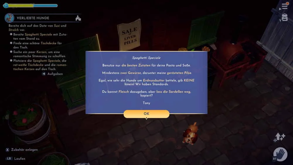 Wenn du versehentlich die falschen Zutaten verwendet hast, dann kannst es es einfach nochmal probieren. Die speziellen Zutaten in der Quest sind nicht begrenzt. Zusammen mit der Tischdecke und den Kerzen kannst du jetzt das Dinner für Susi und Strolch anrichten und damit die Quest beenden.