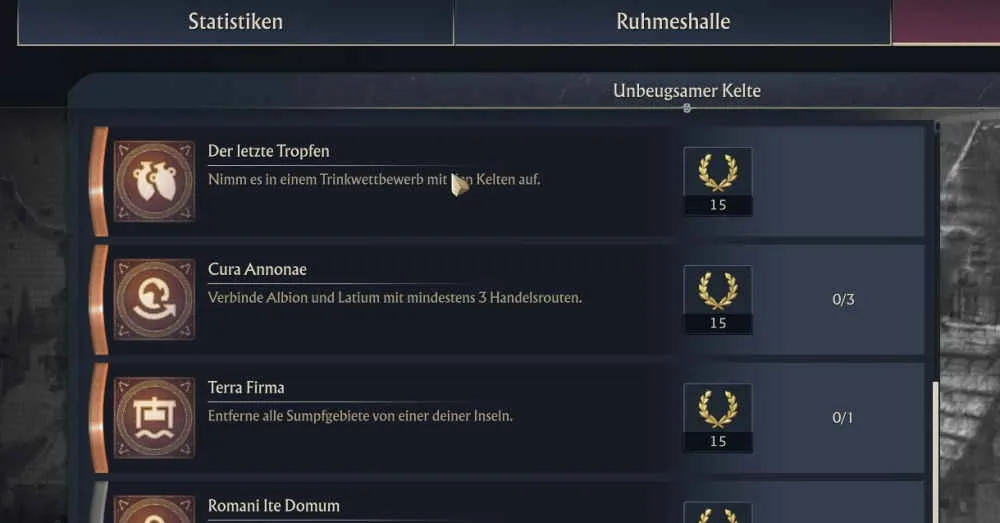 In Anno 117 Pax Romana kannst du dir unter anderem über die Auszeichnungen deine Ruhmpunkte verdienen. Den Ruhm kannst du dann gegen verschiedene Belohnungen eintauschen. Wenn du gerade im Auszeichnungen-Tab unter der Kategorie „Unbeugsamer Kelte“ Die Aufgaben erledigst, dann fragst du dich vielleicht, wie kann ich einen Trinkwettbewerb mit den Kelten aufnehmen? Was muss ich für die Lösung von „Der letzte Tropfen“ Aufgabe machen?