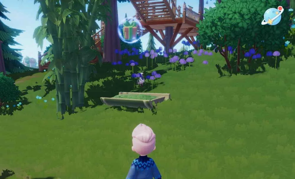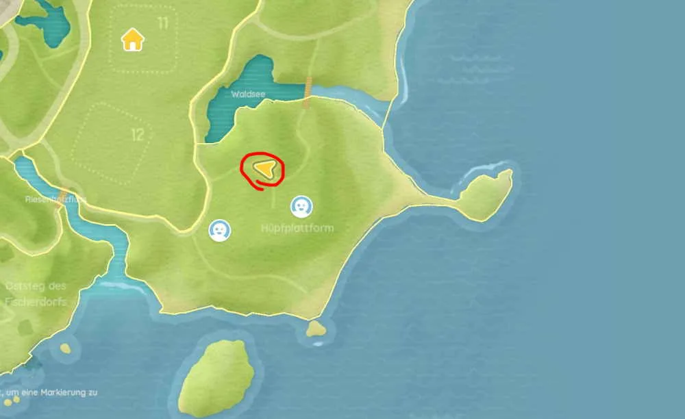 Für die Pandas musst du in den Südosten der Insel in das Gebiet „Hüpfplattform“ reisen. Dort angekommen, siehst du dann nicht nur ein großes Holzgerüst mit mehreren Plattformen, sondern in dem Gebiet steht auch einiges an Bambus herum. Der Bambus ist schon einmal ein gutes Zeichen für Pandas in der Nähe. Der Futtertrog steht ein paar Meter nördlich von dem Hüpfplattform-Schriftzug auf der Karte. Den genauen Fundort habe ich nochmal im Screenshot markiert.