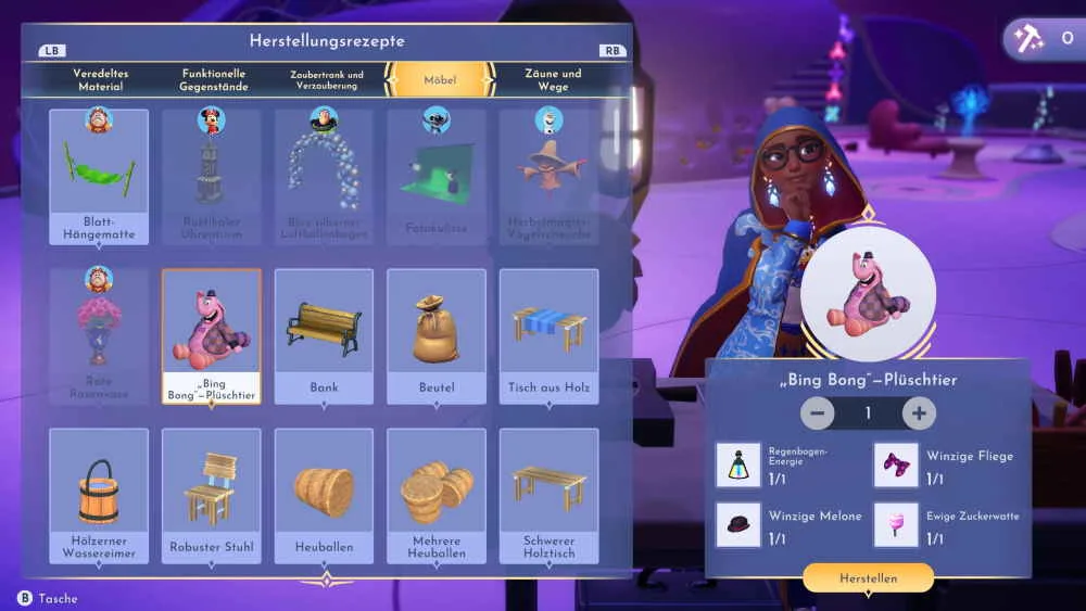 Zusammen mit der Regenbogen-Energie kannst du jetzt an der Werkbank das Bing Bong Plüschtier herstellen. Das Plüschtier ist reine Deko und hat ansonsten keinerlei Funktion.