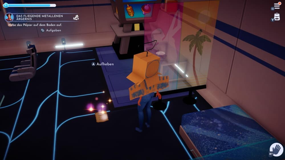 - In dem versteckten Bereich geht es jetzt auf die Suche nach dem Roboter-Kostüm. Die beiden Kostüm-Teile befinden sich in der Truhe, in der man auch noch süßen Popcorn und Zuckerwatte findet. Nachdem man die Taschen aus der Truhe geholt hat, muss man diese noch über das Inventar öffnen und erhält dann den Roboter Hut und das Roboter Kostüm, die man jetzt über die Garderobe anziehen muss. In der Roboter-Verkleidung geht es jetzt zu EVE und man erhält das Rezept für das Gericht „Freund am Haken“.
