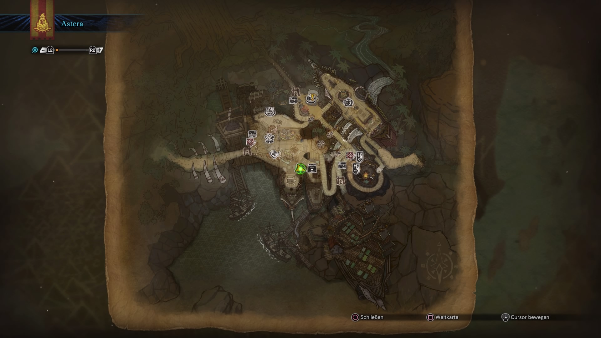 - Sucht in der Siedlung Astera eure Jäger-Gemächer auf. Die findet ihr entweder auf der Handelshof-Ebene, ganz in der Nähe des Tisches, an dem sich der Kommandant immer aufhält. Oder ihr schaut auf der Kantinen-Ebene von Astera vorbei. Auf dem Weg zur Schmiede findet ihr da einen weiteren Eingang zu euren Jäger-Räumen in Monster Hunter: World.