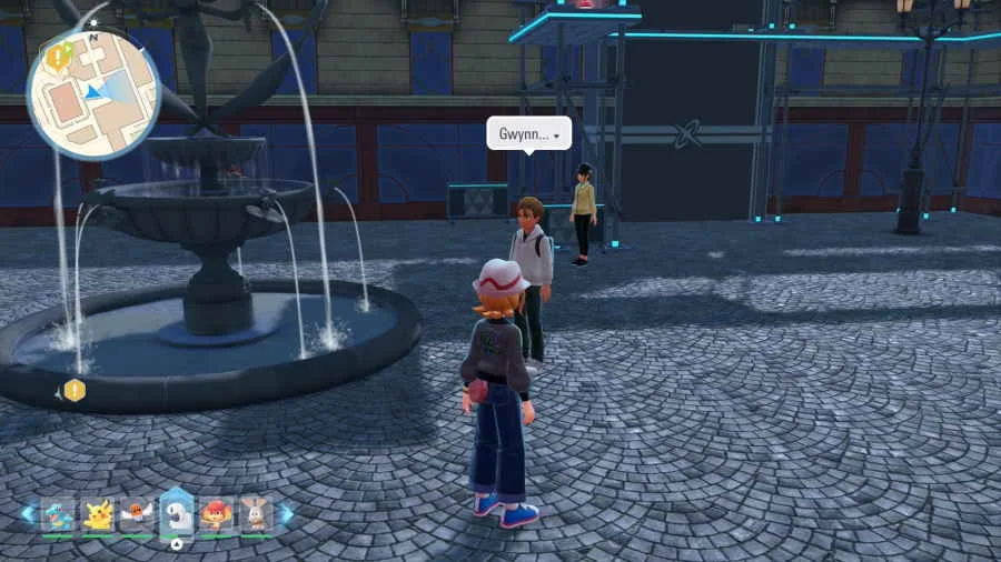 Die NPCs haben alle Sprechblasen mit Gwynn über dem Kopf. Jetzt kannst du entweder mit allen NPCs sprechen und so etwas über ihren Aufenthaltsort herausfinden, oder aber du sprichst direkt mit dem richtigen NPC. Gesucht wird der NPC mit dem grauen Pullover rechts neben dem Brunnen.