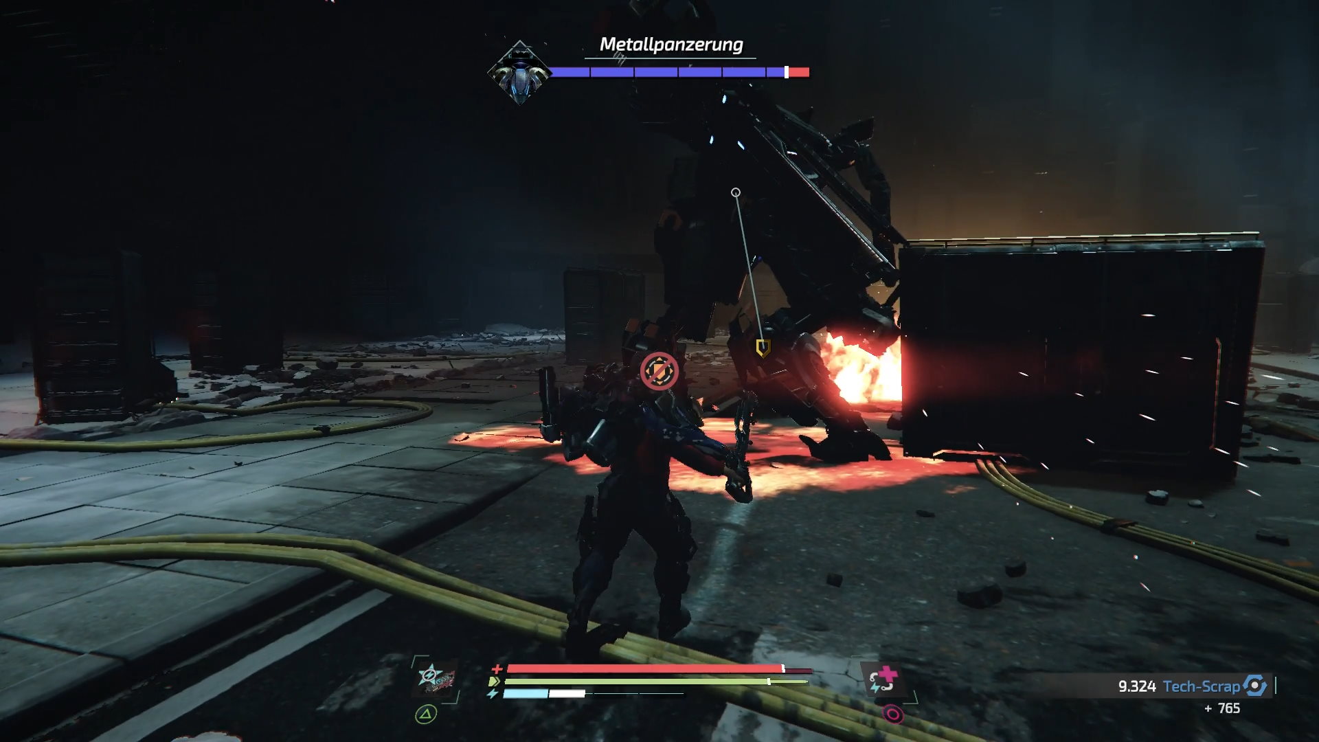 Sobald eine riesige rote Markierung auf dem Boden aufleuchtet, rennt ihr davon weg. Denn da landet ein riesiger Metallarm, der euch sonst zerquetscht. Eure Drohne könnt ihr im Kampf vergessen, weil der Boss sie mit Elektroimpulsen dauernd deaktiviert. In der zweiten Phase setzt er zudem Feuer ein und setzt die Öllachen in Brand.