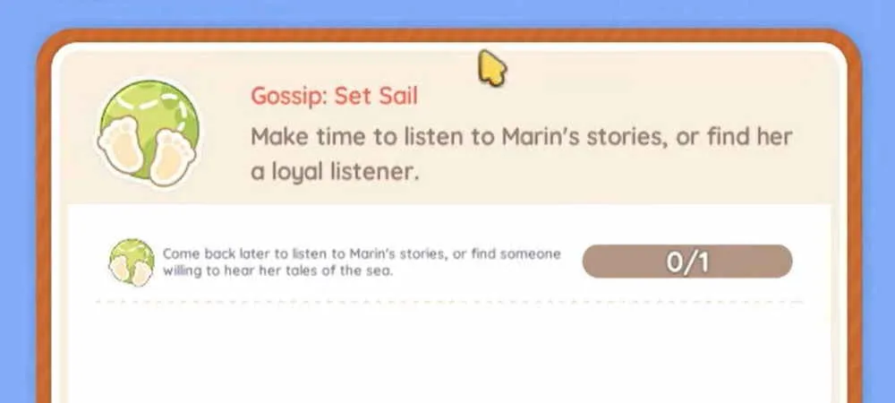 Bevor du die Segel setzen Anekdote starten kannst, musst du erst einmal die Quest von Marin annehmen. Sprich mit Marin (sollte auch im Quest-Log angezeigt werden) und sie erzählt dir dann eine Geschichte. Höre ihr aufmerksam zu, was sie über die See zu sagen hat. Keine Sorge, der Inhalt des Gesprächs ist eigentlich gar nicht wichtig. Nach dem Gespräch startet dann auch schon automatisch die Anekdote mit dem Segel setzen (engl. Gossip: Set Sail). In der Aufgabenbeschreibung heißt es dann, dass du entweder zu Marin zurückkehren und dir nochmal eine Geschichte anhören oder jemanden finden solltest, der sich die Geschichten anhört. Stellt sich die Frage: Was muss ich hier genau machen und wann kann ich wieder mit Marin sprechen?