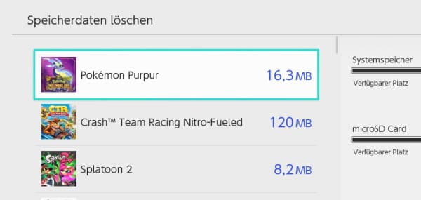 - Über die „Datenverwaltung“ kann man jetzt über „Speicherdaten löschen“ den Eintrag von „Pokemon Purpur“ oder „Pokemon Karmesin“ auswählen und über „Speicherdaten loschen für Benutzer xy“ löschen.