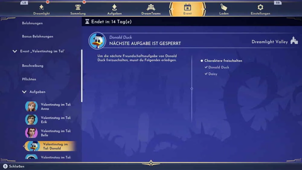 Mit dem Disney Dreamlight Valley Susi und Strolch-Update kommen neben zwei neuen Charakteren auch noch weitere Neuerungen ins Spiel. Dazu gehört unter anderem auch das Event „Valentinstag im Tal“, welches du seit dem Update unter dem „Event“-Reiter findest. In der Beschreibung heißt es „Die Liebe liegt offiziell in der Luft! Unser Valentinstagevent läuft ab heute bis zum 25. Februar“ und weiter „schließe tägliche Aufgaben für einige der bekanntesten Liebespaare ab und hole dir tolle Belohnungen“. Bei einem Blick auf die Aufgaben sind alle Valentinstags-Aufgaben gesperrt. Stellt sich mir die Frage: Wie kann ich die Aufgaben bei dem Valentinstag im Tal entsperren und freischalten?