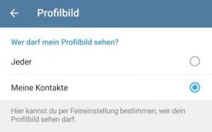 - Unter dem Abschnitt „Privatsphäre“ kann man dann bei „Profilbild“ die Sichtbarkeit von „Jeder“ auf „Meine Kontakte“ umstellen.