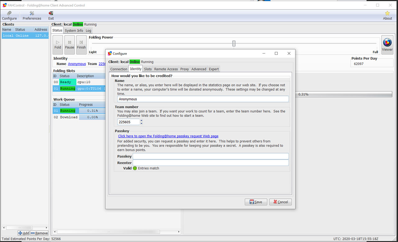 Identity: Ebenfalls im »Configure«-Menü findet ihr diesen Punkt. Grundsätzlich lässt sich [email protected] komplett anonym nutzen. Wer mag, der kann aber auch einen Namen eingeben, um in den Statistiken auf der Webseite aufzutauchen oder aber einem Team beitreten.
