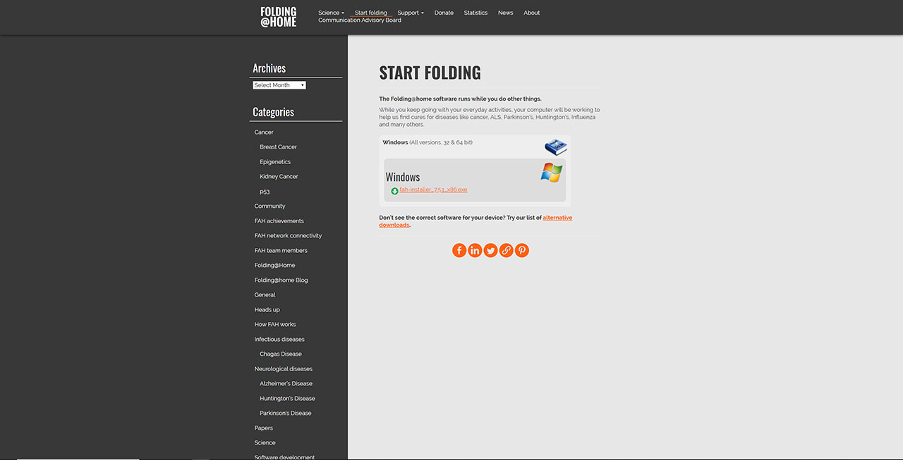 Wenn ihr [email protected] herunterladen wollt, dann klickt auf der Startseite den Button »Start Folding now.« Auf der nachfolgenden Seite führt euch der Button »Download now« zur Download-Seite. Hier findet ihr schließlich die Installationsdatei für [email protected], aber auch alternative Downloads für macOS oder Linux, wenn ihr dem Link zu alternativen Download folgt.