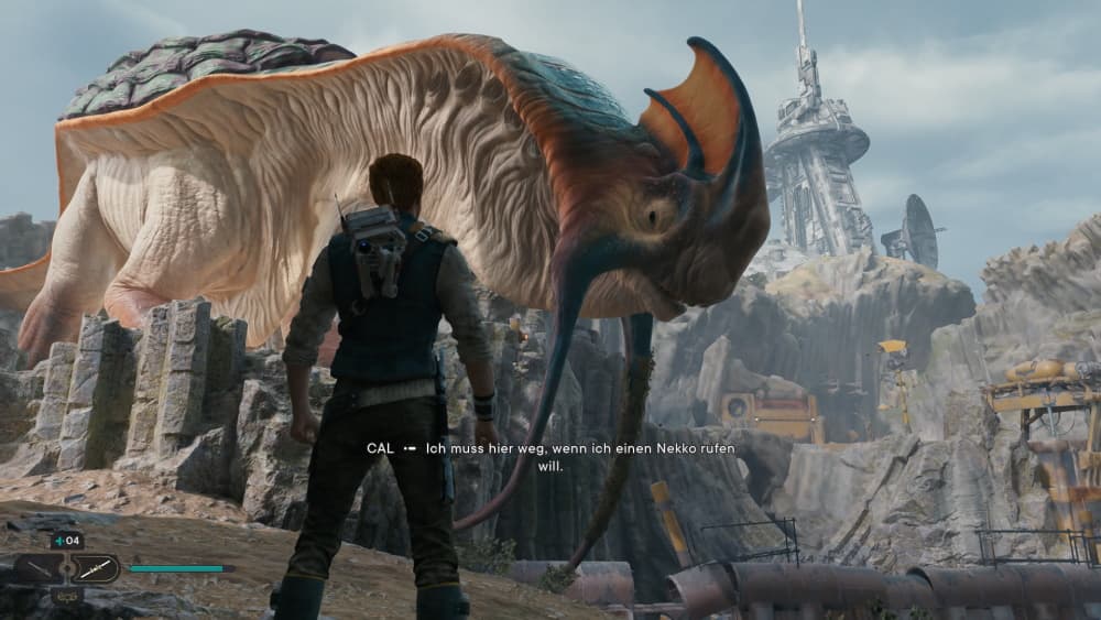 - Die gesuchte Kreatur findet man in dem Abschnitt „Verlassener Damm“ und der Fundort wird nach dem Start der Quest auch auf der Karte markiert und angezeigt. Sofern verfügbar, sollte man sich zu dem Meditationspunkt „Südliches Gebiet“ per Schnellreise teleportieren, zu der großen Kreatur laufen und über die „Fokus“-Fähigkeit zähmen, sodass die Kreatur nach unten kommt. An dem rechten Stoßzahn hochklettern und oben auf die Plattform springen.