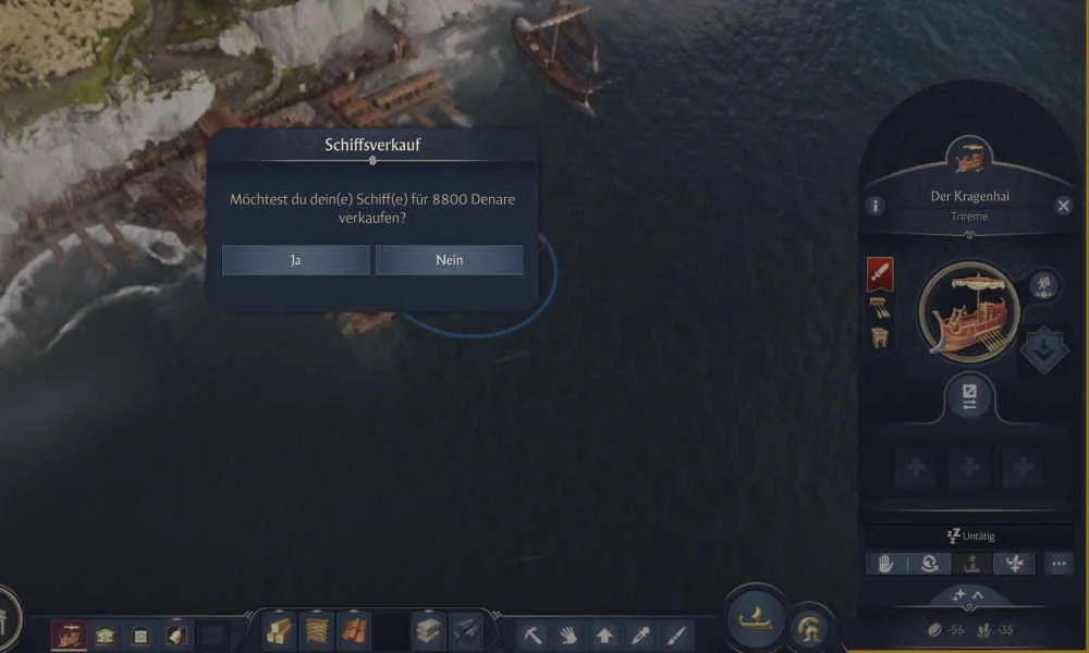 Suche dir also einen kaiserlichen Hafen in Albion oder Latium und sobald du in der Nähe des Hafen bist, wird der Verkaufen-Button klickbar und du kannst das Schiff verkaufen. Je nach Größe des Schiffes unterscheiden sich die Verkaufspreise. Die eingesetzten Materialien und die Denare bekommst du allerdings nicht komplett zurück. Dennoch lohnt sich der Verkauf im Vergleich zum manuellen Zerstören/Abriss, da du etwas wiederbekommst. Der Verkauf kann übrigens nicht rückgängig gemacht werden. Du solltest dir also sicehr sein, dass du das Schiff erst mal nicht benötigst. Du kannst es natürlich im Hafen neu bauen.