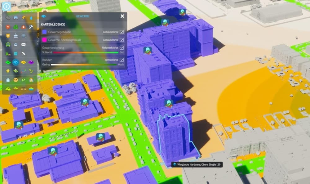 Wenn bei einigen Geschäften in einem bestimmten Bereich die Meldung mit den nicht genügend Kunden angezeigt wird, dann liegt das häufig daran, weil man die Gewerbezonen falsch geplant hat und die Wohnzonen zu weit weg liegen. Als Erstes sollte man sich anschauen, wie gut sich die Gebiete für Geschäfte eignen und wie viele potentielle Kunden dort unterwegs sind. Das geht am einfachsten, in dem man im Spiel die I-Taste drückt und dann oben links die Ansicht für das Gewerbe öffnet. Hier kann man jetzt zum einen die Gewerbeeignung und zum anderen die Kundschaft sehen, die dort zu erwarten ist. Häufig tritt das Problem mit den „Nicht genügend Kunden“ in den Gebieten mit geringen Kunden und schlechter Gewerbeeignung auf.