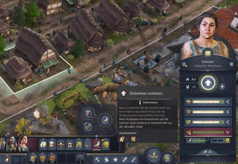 Also kurz gesagt: Upgrade das keltische Wohnhaus der Wander auf den Schmied auf. Sorge dann dafür, dass die Bedürfnisse erfüllt sind und du kannst nochmal auf den „Einwohner ausbauen“ Button klicken. Notwendig dafür bei den keltischen Wohnhäusern unter anderem ausreichend Trinkörner und Clanschilde.