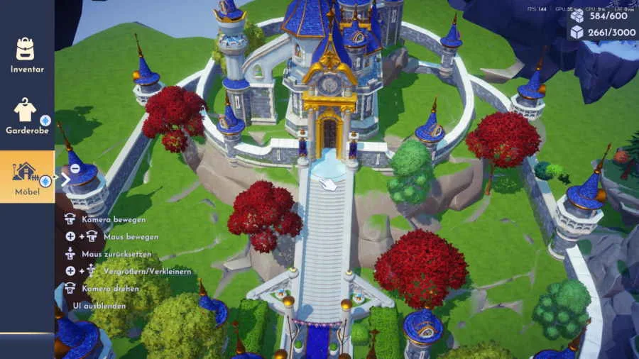 Stellt sich jetzt noch die Frage: Wie kann ich das Schloss ändern? Dafür musst du im Spiel das Inventar öffnen und dann auf die Möbelansicht wechseln. Bewege dich dann zum Traumschloss und markiere es mit der Hand. Am besten zoomst du vorher etwas heraus, dann kannst du das Gebäude einfacher markieren. Jetzt kannst du das Gebäude auswählen und das Aussehen ändern, in dem du den oben freigeschalteten Halloween-Skin einstellst.