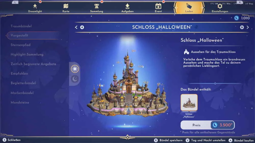 In dem Ingame-Shop findest du aktuell unter den vorgestellten kosmetischen Items das „Schloss Halloween“. Das Schloss ist vereinfacht gesagt ein Skin für das Traumschloss und kostet 3.500 Mondsteine.