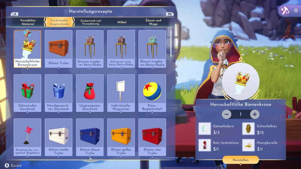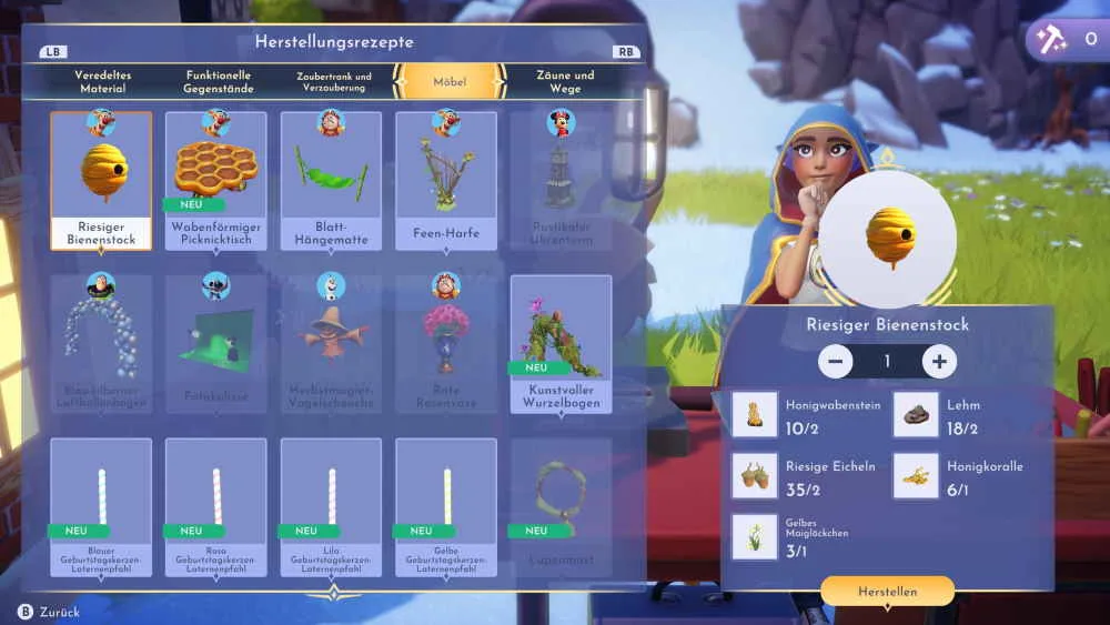Mit den Materialien geht es dann zur nächsten Werkbank und du die Gegenstände für Tigger herstellen. Stelle drei rieseige Bienenstöcke, zwei wabenförmige Picknicktische und eine Feen-Harfe her. Ersetze die riesigen Bienenstöcke neben den riesigen rosa Blumen in den Hundertmorgenfeldern und stelle die restlichen Möbel auf.