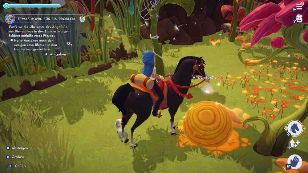 Sprich zuerst mit Tigger über das Problem in seinem Baumhaus. Dort angekommen siehst du dann auch schon einige Bienen durch den Raum fliegen. Der Grund für die Bienen sind die Überreste des abgefallenen Bienenstocks in den Hundertmorgenfedern. Deine Aufgabe ist es jetzt, die drei abgefallenen Bienenstöcke zu entfernen. Stelle dich dazu einfach mit dem Pferd vor den Bienenstock und entferne sie. Du kannst die Bienenstöcke relativ einfach an den riesigen rosa Blumen in den Hundertmorgenfeldern erkennen. Wichtig ist übrigens die Wahl des Pferdes. Ich konnte die Bienenstücke nur mit Khan zerstören.