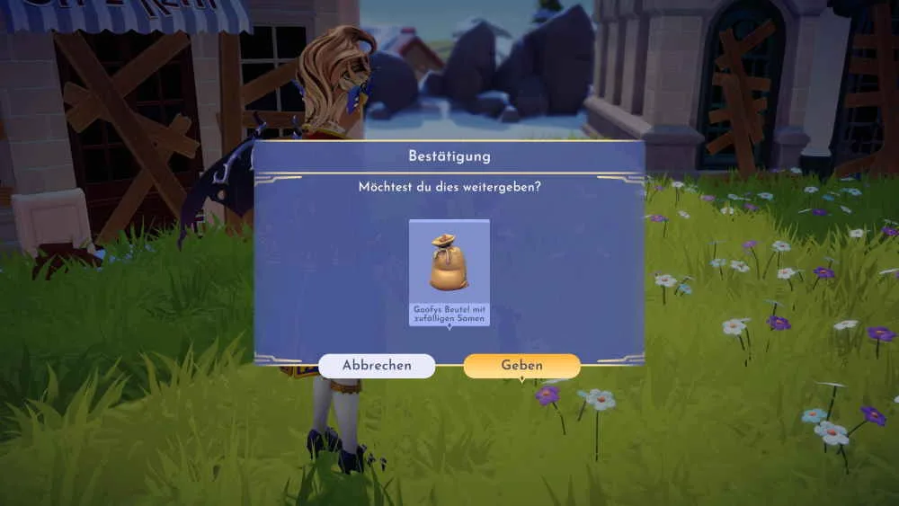 Bringe Remy den Gegenstand namens „Goofys Beutel mit zufälligen Samen“. Den Beutel mit Samen hast du automatisch im Gespräch mit Goofy erhalten. Wichtig ist, dass du den Samenbeutel im Inventar hast, wenn du zu Remy gehst. Remy überreicht dir jetzt nicht sofort das von Goofy dringend benötigte Ersatzrad, sondern zwei neue Samen. Es handelt sich dabei um die geheimnisvolle Saat 1 und 2. Pflanze die Samen ein und bewässere sie einmal mit der Gießkanne. Die Wartezeit bis zur Ernte ist relativ kurz und du musst nur fünf Minuten warten. Du kannst die beiden Samen überall anpflanzen.