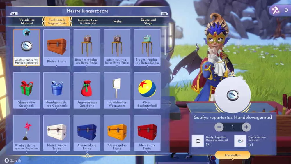 Zum Abschluss geht es nochmal zu Remy und du kannst sein Restaurant eröffnen. Damit ist die Köstlichkeiten für Pferde Quest beendet und du bekommst als Belohnung das Ersatzrad für Goofy. Gehe zur nächsten Werkbank und stelle Goofys repariertes Handelswagenrad her.
