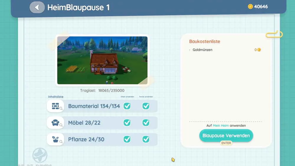 Platziere das Haus über die Blaupause erneut auf der gewünschten Position. Entferne das komplette Haus von deinem Grundstück. Öffne das Blaupausen-Menü und schau dir die Haus-Blaupause an. Unten rechts kannst du jetzt die „Blaupause verwenden“ und damit das Haus neu auf dem Grundstück aufstellen. Achte darauf, dass du das Haus an der richtigen Position aufstellst, da du es wie oben beschrieben nicht nachträglich verschieben kannst. Du kannst es natürlich erneut verschieben, indem du es wieder entfernst und mit einer Blaupause neu aufstellst.